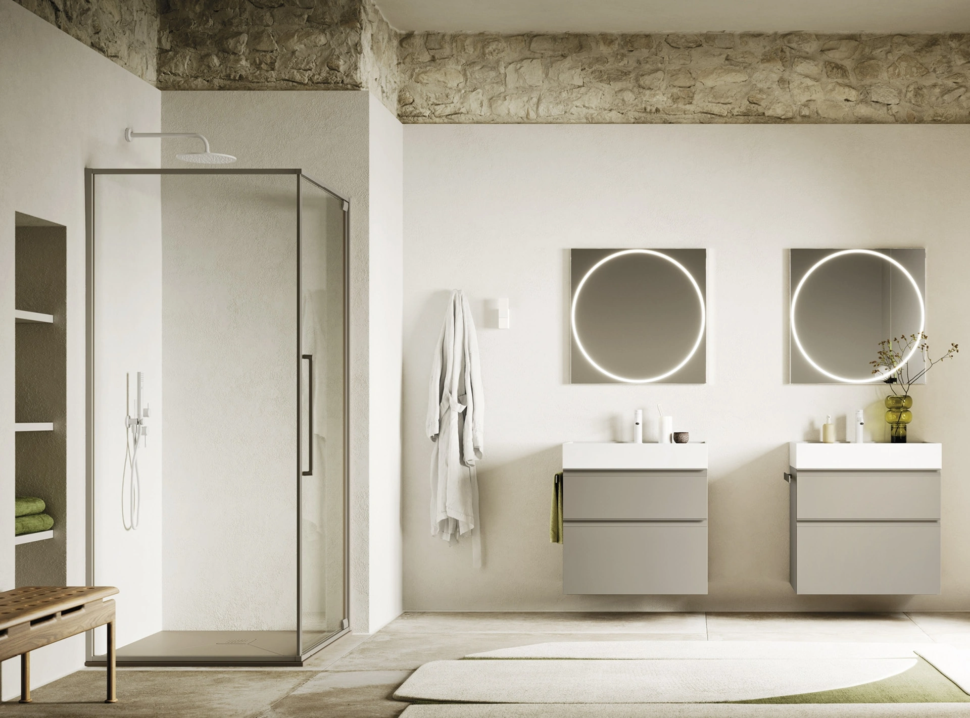 Arreda la stanza del benessere moderno perfettamente con Sky Sail 32, mobili bagno sospesi e accessori in laccato opaco di Arbi.